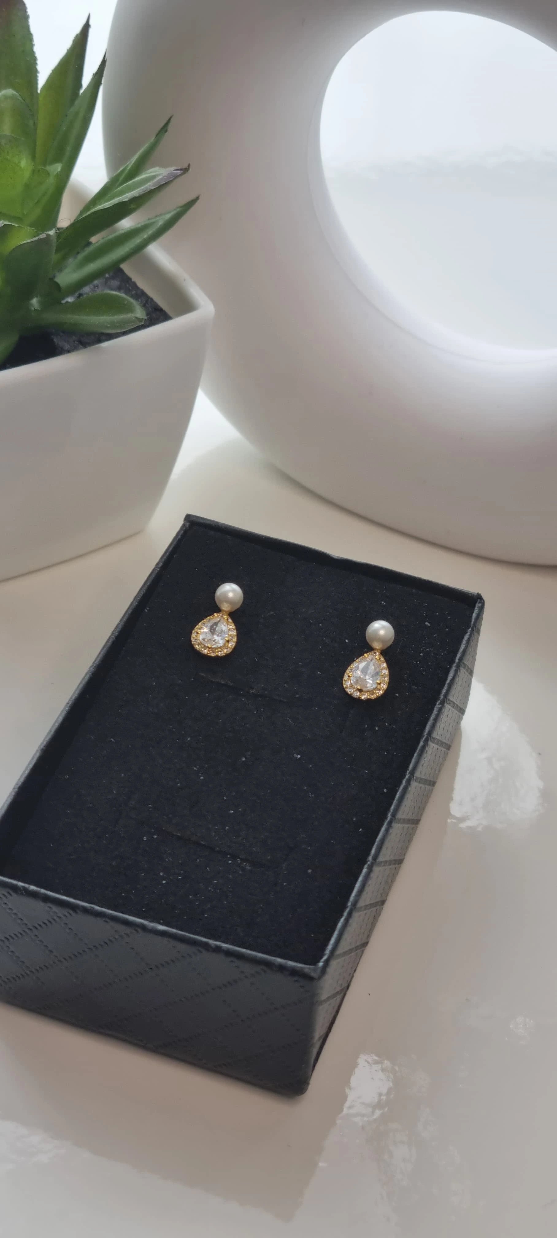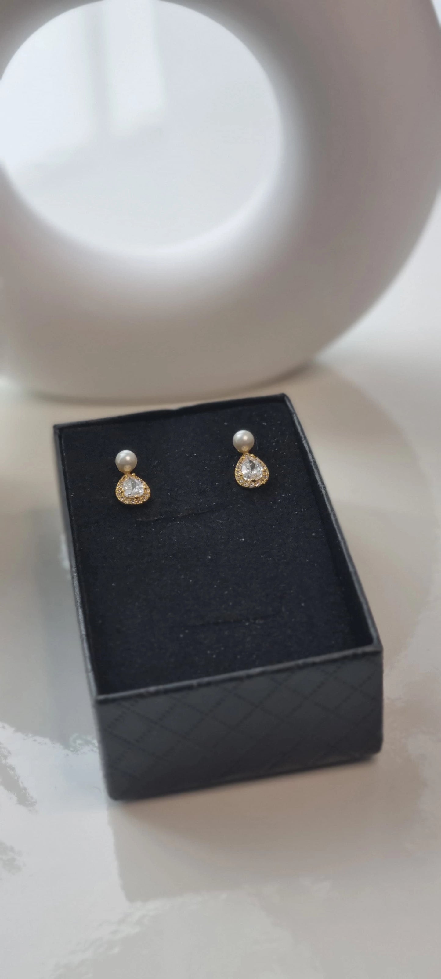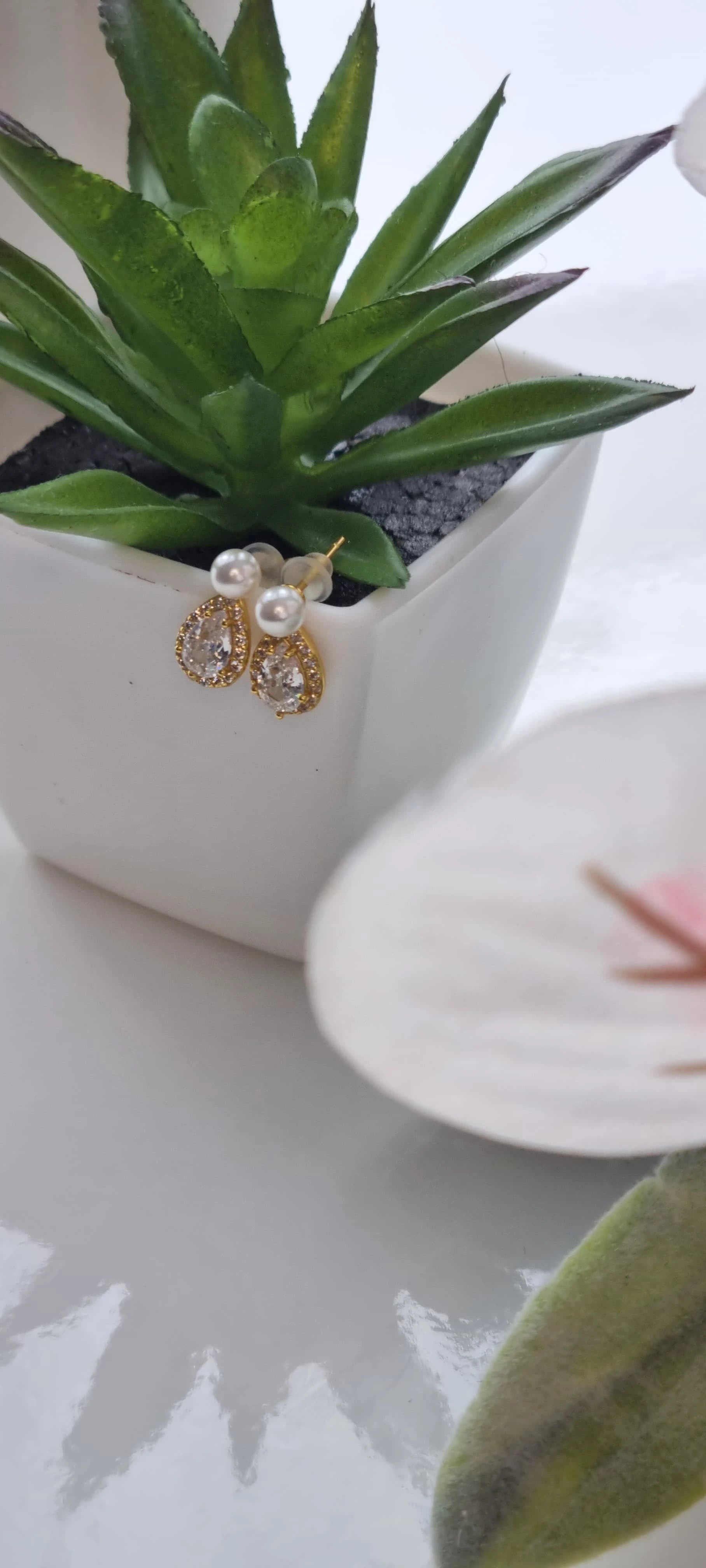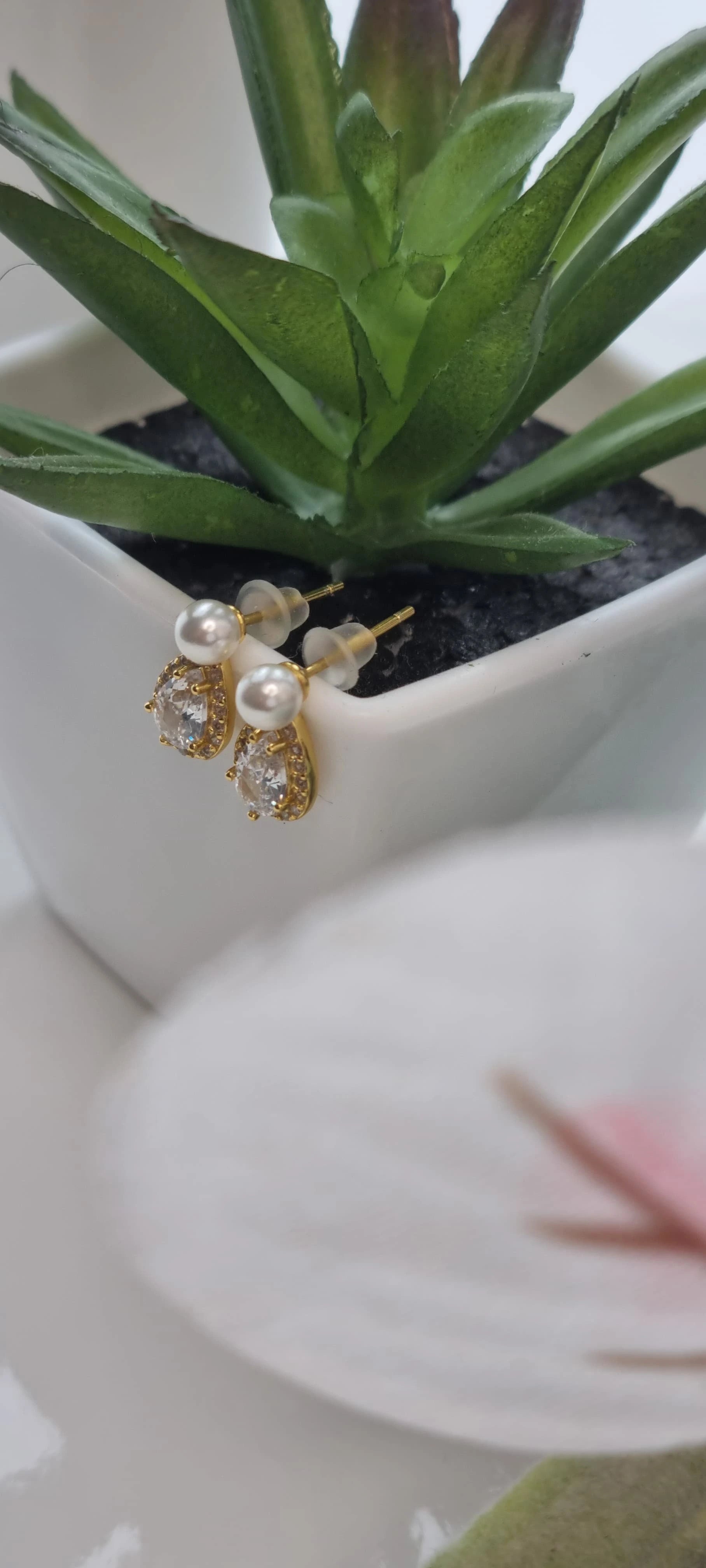 14k Gold Plated Pearl Stud Earrings with Shiny Zircon – Elegant Sterling Silver Water Drop Earrings for Women