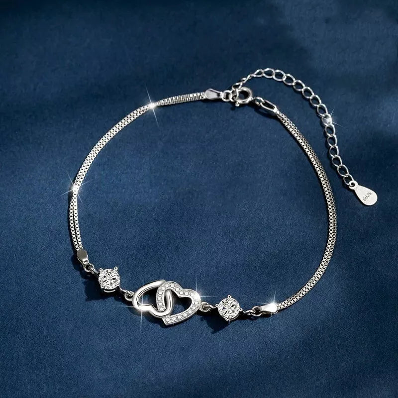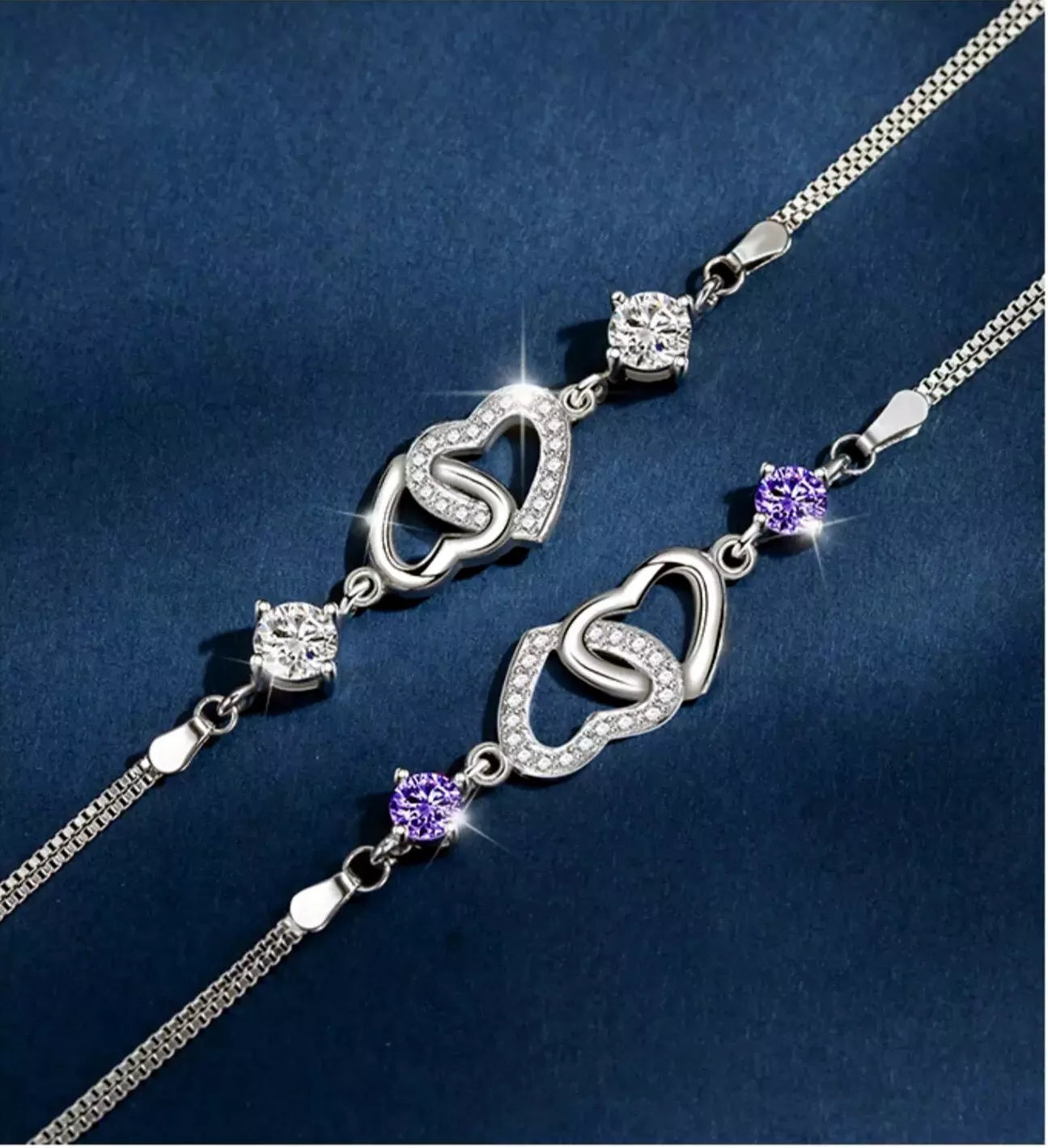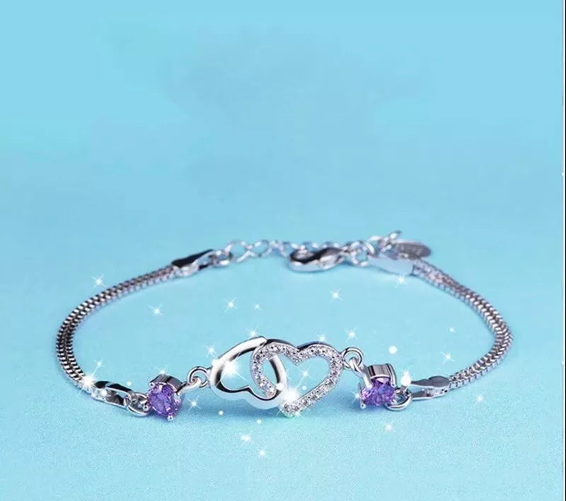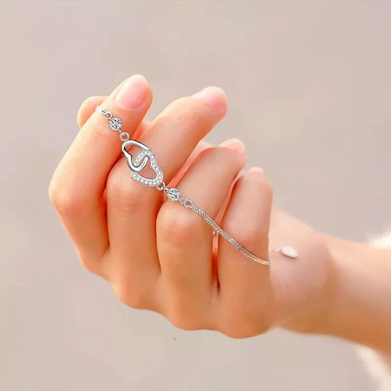 925 Sterling Silver Crystal Double Heart Linked Charm Bracelet