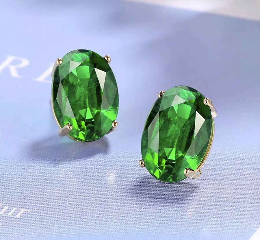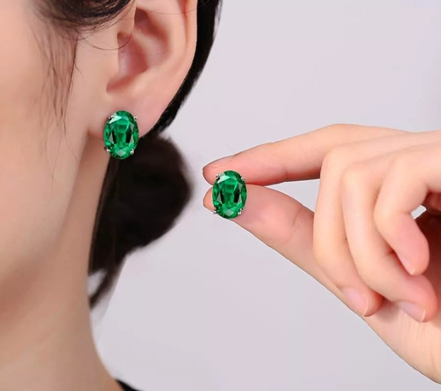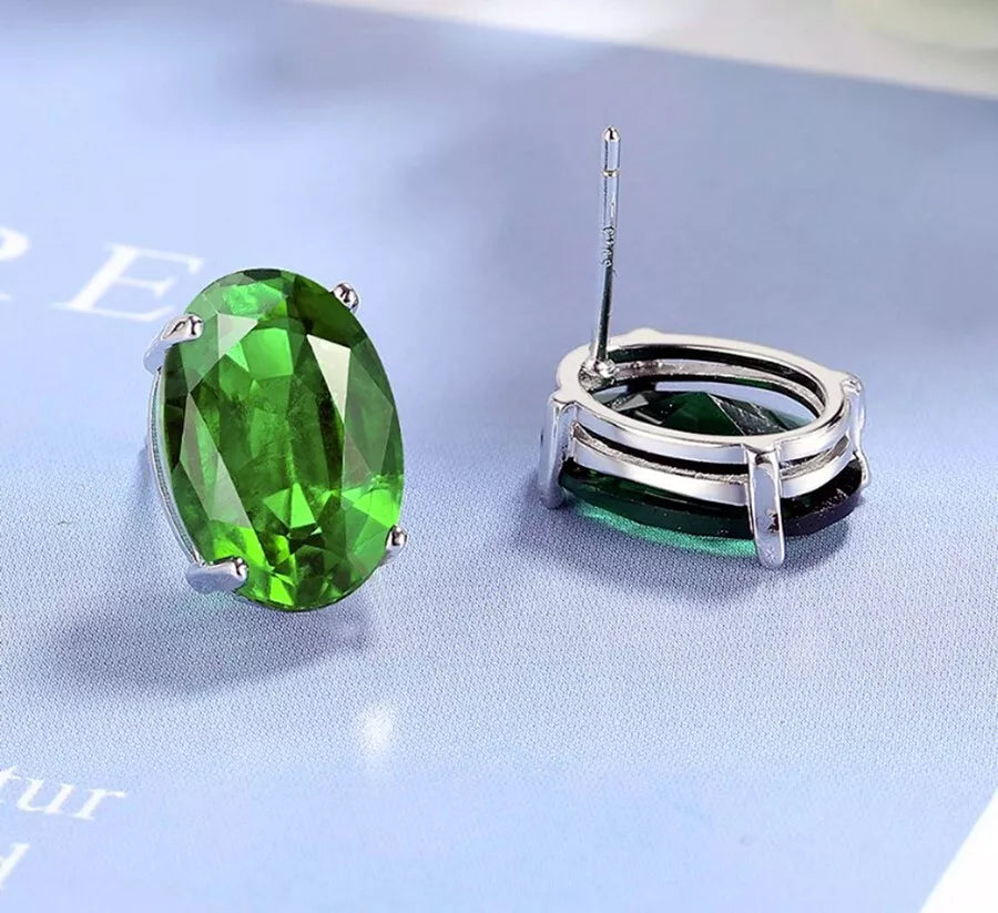 925 Sterling Silver Green Crystal Oval Stud Earrings