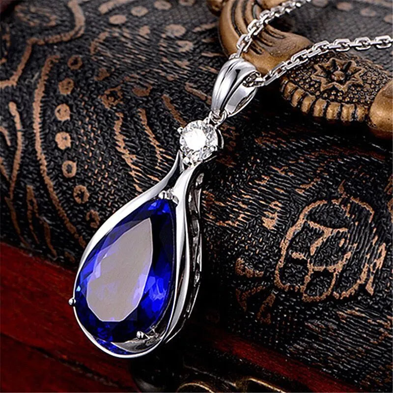 Blue Crystal Water Drop Pendant Necklaces | 925 Sterling Silver Tear Drop Necklace