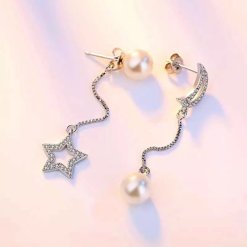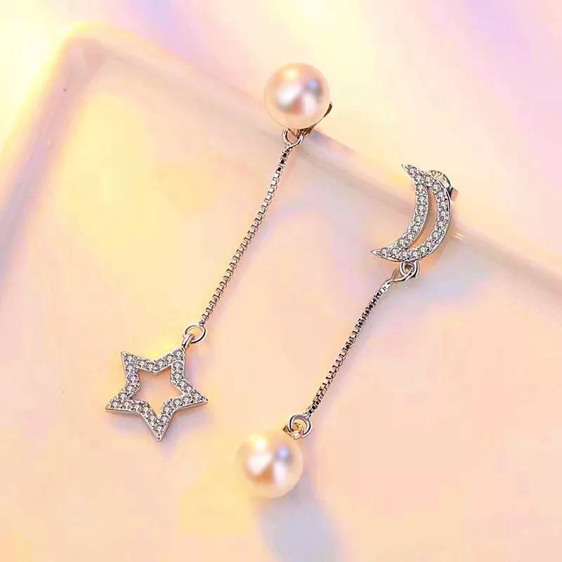 Women's Pearl Moon & Star Stud Chain Drop Earrings